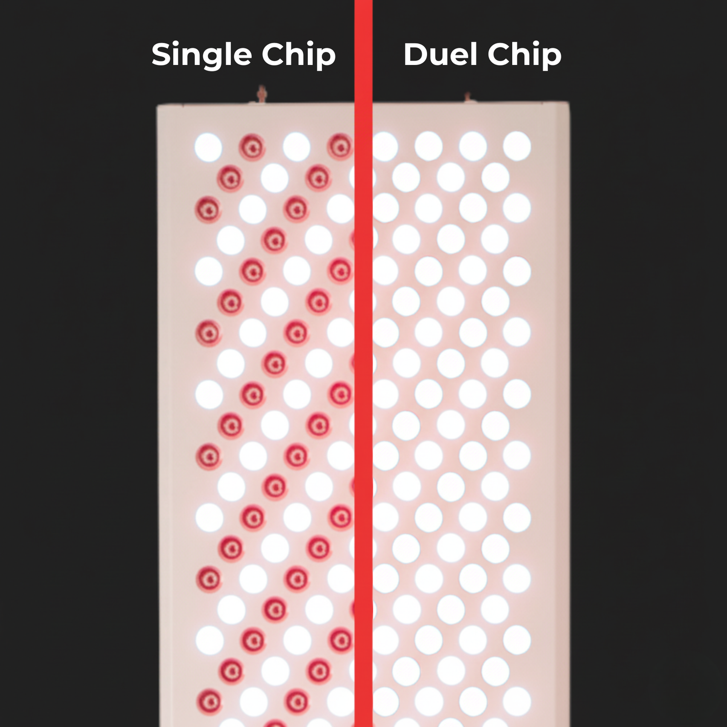 Dual-Lens LEDs deliver more usable light where your body needs itStandard red light panels use single-chip LEDs, meaning only one wavelength comes from each light point. This creates uneven hotspots and dark gaps — so some areas of your skin and muscles receive much less light than others.